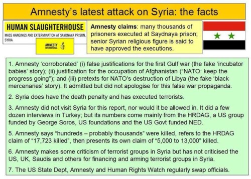 Para não cansar muito, gostava de tocar em só mais um tema, o mito dos 13 mil mortos/torturados na prisão síria de Saidnaia, da autoria da ignóbil Amnesty International. Tendo enviado ZERO pessoas ao local e baseando-se apenas em testemunhos possuidores de ZERO provas, a AI produziram uma imensa quantidade de material propagandis acusando o governo sírio de ser responsável pelo genocídio de mais ou menos 13 mil pessoas. Acusações extraordinárias requerem provas mais que extraordinárias. Mas não, a AI não tem sequer provas, apenas reconstruções em 3D super cool, testemunhos e um relatório sem pés nem cabeça. Eu li-o de ponta a ponta, mais do que uma vez. Não encontro nenhuma prova de nada. Encontro muitas suposições ao péssimo estilo pós-modernista: acreditar em algo chega para provar o que quer que seja.