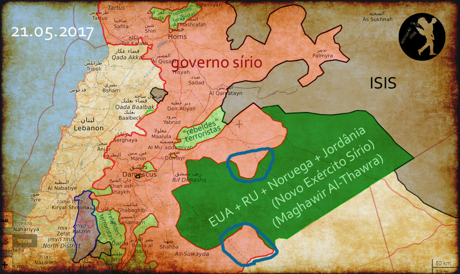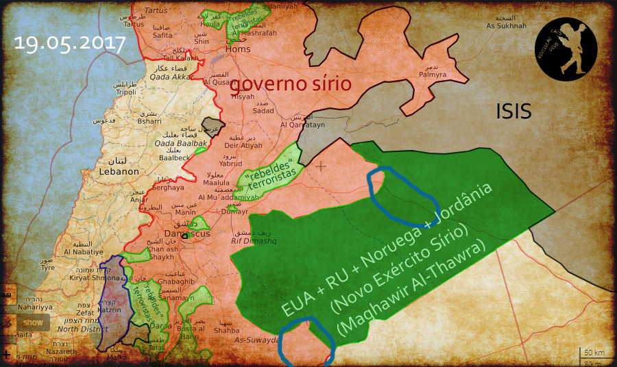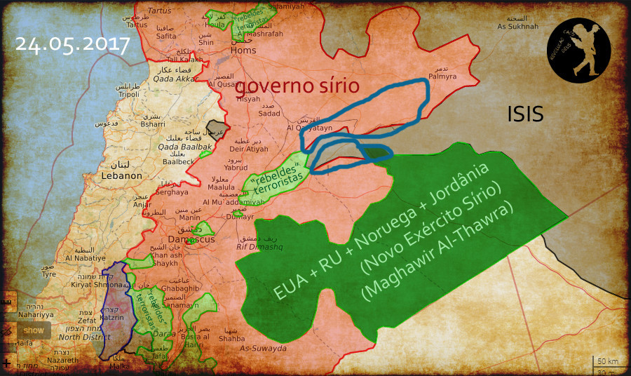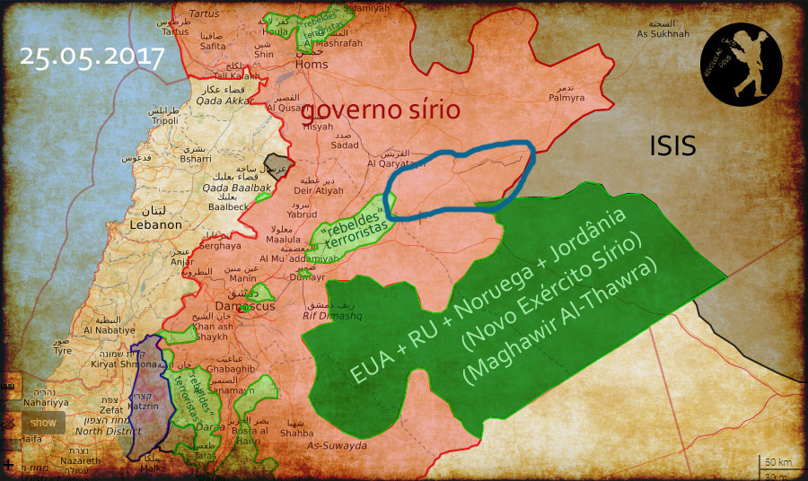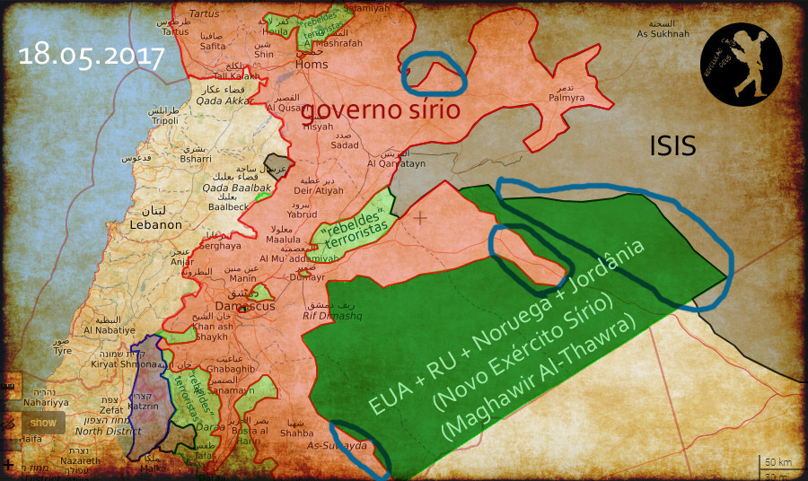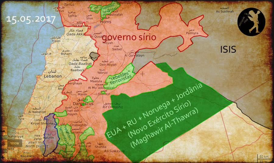 Mas bom, como uma imagem, diz-se por aí, vale mais que 1000 palavras, a sequência seguinte valerá umas 8000 mil. Pela comparação dos mapas datados e legendados poderá ter uma ideia precisa dos avanços sírios contra o ISIS, assim como contra o novo inimigo sírio sobre qual escrevi o artigo intitulado O Plano C. Para quem não leu o artigo, esse novo inimigo, embora composto por forças armadas dos EUA, Reino Unido, Noruega e Jordânia que entraram ilegalmente em território sírio há poucas semanas atrás, dá pelo orwelliano nome de Novo Exército Sírio! Hehehe! Ah, e para aumentar a sua credibilidade, opera em colaboração com a organização terrorista internacional Maghawir Al-Thawra. Enfim! Aqui ficam os mapas:
