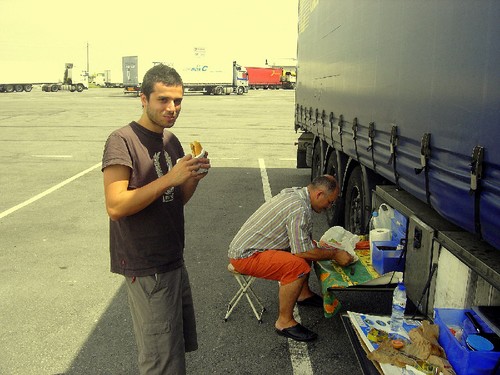 O senhor ao início, embora educado e amável, mostrava-se (naturalmente) um pouco reservado e diria até desconfiado. Faltava-lhe algo que lhe mostrasse um pouco das nossas personalidades de forma a assegurá-lo que estava em face de dois jovens aventureiros e não de perigosos assaltantes fazendo-se passar por viajantes. Esse algo veio com as conversas que travámos (eu e o Diogo) ao telefone com o nosso colega Ivo que acabara de sofrer um terrível azar (ler estória La Guardia Civil). Se antes dos telefonemas imperava no ar um certo desconforto resultante do silêncio tímido e/ou receoso, depois, e por vontade expressa do tagarelíssimo senhor, instalou-se naquele camião em andamento um verdadeiro consultório de psicologia para condutores de camiões e análise de seus traumas!