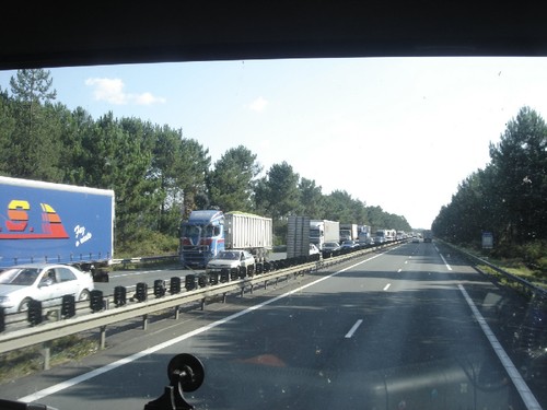 No dia seguinte encontrámos o nosso companheiro de viagem nas casas-de-banho públicas e juntámos-se a ele para um café matinal no restaurante da estação de serviço. Aí, durante a conversa de pequeno-almoço o motorista convidou-nos a voltar à estrada com ele. No dia anterior ele tinha-nos explicado que, normalmente, camiões com destino a Itália e aos países de leste costumam usar a rota que passa por La Jonquera, junto aos Pirenéus orientais onde passam a primeira noite. Pelo contrário, aqueles cujo destino é o norte da França ou Europa do norte têm por hábito acabar a primeira etapa em Irún (onde nos encontrávamos). Ora, precisamente pelo seu trajecto ser atravessar a França numa diagonal para nordeste que o levaria para Alemanha, de início hesitámos em aceitar o convite. A questão principal era: se por um lado teríamos a hipótese de partir de imediato, por outro dirigir-nos-íamos para a zona errada, o que nos obrigaria posteriormente a fazer quilómetros extra para voltar à nossa rota. Ambas as opções tinha prós e contras e ficámos deveras indecisos. A solução (pragmática) foi a de pedir boleia a outros camionistas na meia hora seguinte, enquanto o camionista português fazia os preparativos para partir e, findo esse tempo, se não tivéssemos encontrado nada de interessante, juntar-nos-íamos a ele.
