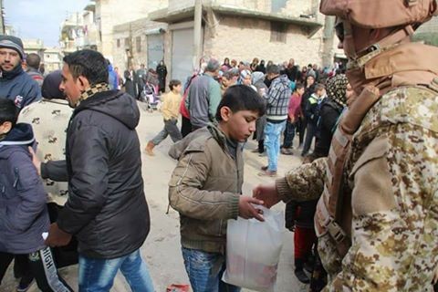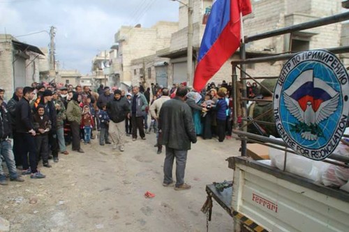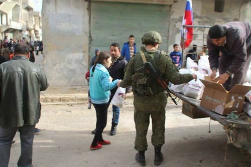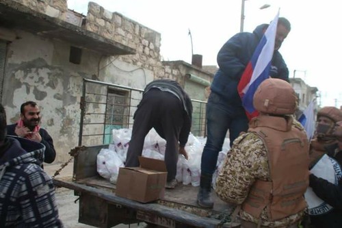 Não contam que militares russos distribuem ajuda alimentar russa em Aleppo: