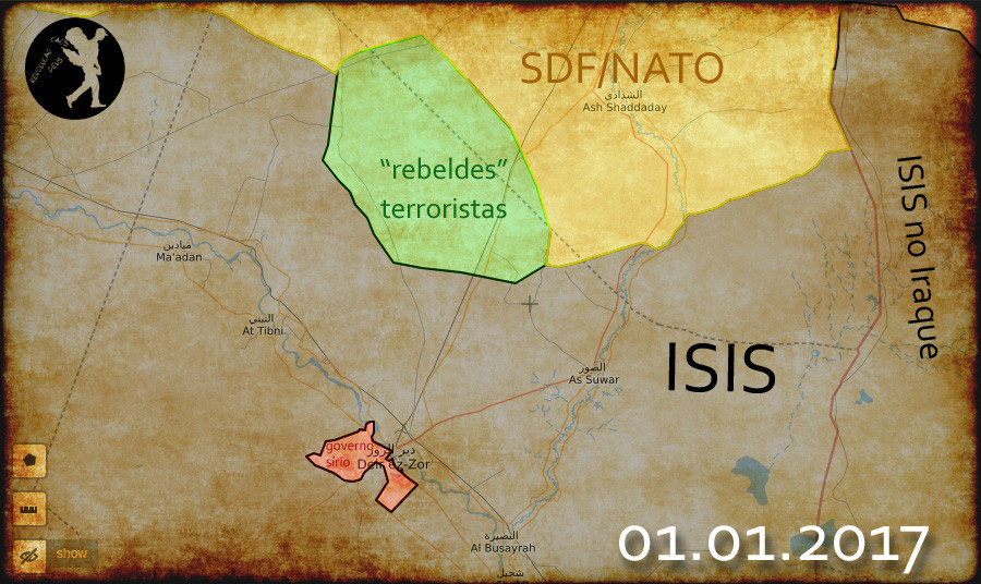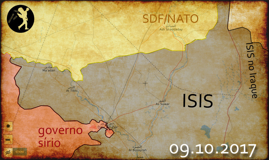A história do terrorismo ISIS-curdo-americano repete-se sem cessar. Se há meses atrás o local escolhido foi Raqqa, desta vez é Der-ez-Zor. Olhe caro leitor para o mapa do conflito sírio e constate que os EUA este ano não mexeram uma palha sequer contra ISIS no triângulo de terra controlado por esta organização terrorista a norte do rio Eufrates. Porquê tal atitude vinda dos mesmo EUA que querem à força, e contra a lei internacional, criar um "Curdistão" sobre todo o território sírio a norte do rio Eufrates? Não será porque ISIS é super-útil na arte de matar soldados sírios e russos, na arte de reduzir o poder bélico sírio, na arte de espezinhar e violentar civis sírios nesse triângulo de terra? Ahhh, é isso e, portanto, até há poucos dias atrás, era útil aos EUA deixar o ISIS em paz. Só não entende quem não quer!