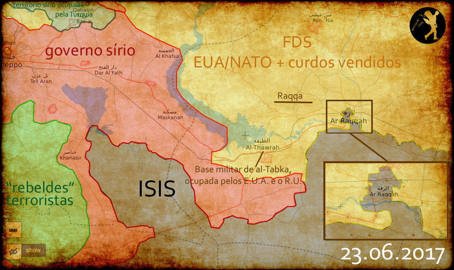 Ainda sobre Raqqa, de acordo com a própria organização terrorista US Army (e quem não acredita que vá consultar o site dessa organização terrorista em www.centcom.mil/), mais de 800 civis foram mortos pelos ilegais e criminosos bombardeamentos da NATO nessa cidade. Quase 200.000 civis fugiram da cidade devido a esses bombardeamentos e representam uma iminente catástrofe humanitária. Raqqa, uma cidade multi-étnica como todas as sírias, ainda que mais de 90% dos seus habitantes fossem árabes, hoje, é uma gigante pilha de escombros provocada por rambos norte-americanos, ingleses e franceses que, além de desrespeitarem a lei internacional com estes bombardeamentos, fazem-no de forma absolutamente bruta, sem objectivos estratégicos como minimizar o número de vítimas ou minimizar a quantidade de estragos. Não, pelo contrário, partem tudo, matam tudo o que se mexe e, consequentemente, quase todos os seus habitantes fugiram. Segundo os próprios EUA, esta cidade onde viviam meia-dúzia de curdos antes da guerra, será entregue às mãos das ilegais forças curdas armadas ilegalmente pelos EUA. O objectivo é simples e, apesar de escandaloso, ninguém o esconde. Os terroristas curdos das FDS-NATO pretendem fazer de Raqqa a sua capital, habitada exclusivamente por curdos. Parabéns Ocidente, criador e patrocinador de limpezas étnicas e perseguidor e diabolizador do multi-étnico e multi-religioso estado sírio! Parabéns! Assad e as forças sírias, por mais que organizem a reconquista do seu país em função da minimização do número de vítimas e quantidades de estragos, e por mais que o documentem, e por mais que façam acordos de paz que evitam a opção militar, são e serão para a propaganda ocidental os tais "carnificinas" que lançam "barris-bombas" por diversão sobre "criancinhas". EUA, França e Reino Unido, por mais que destruam em grande, de forma absurdamente desorganizada, partindo tudo e matando todos, de propósito, como no Laos e no Vietname nos anos 60, da forma mais bárbara possível, não são alvos de críticas dos humanistas-zombies ocidentais. Irra mais à dissonância cognitiva generalizada!