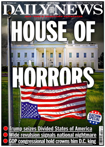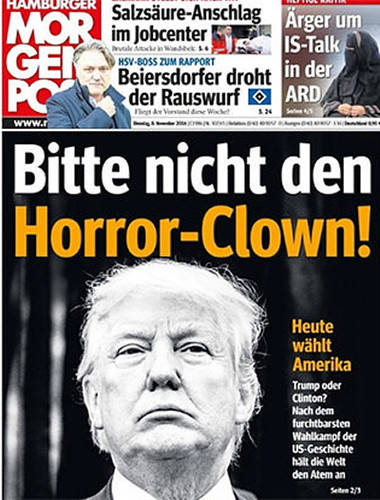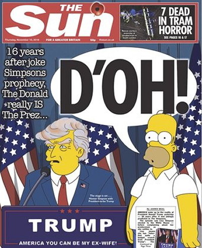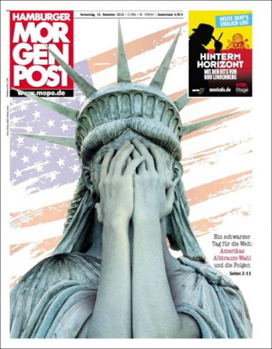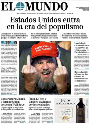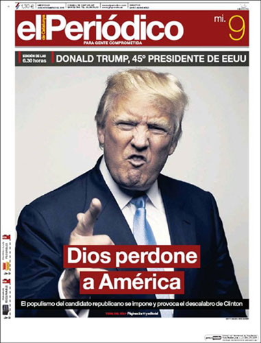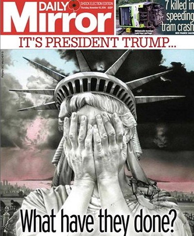 E quanto à malta que leva diariamente com todas estas tretas de sondagens sempre erradas e espantos hipócritas, espantam-se mesmo com tudo isto? Qual era o espanto que numa campanha de Hillary Clinton apoiada por 95% dos media norte-americanos estes dessem como certa a vitória dessa criminosa? Se quase todos esses media que a apoiavam, também financiaram a sua campanha eleitoral, qual era o espanto que adivinhassem a vitória de Hillary que, governando, trazer-lhes-ia os devidos retornos económicos? Eu não acho nada espantosa a vitória de Trump, espantoso é o "espanto" dos mainstream media conspurcados! Mais espantosas ainda são as formas grotescas, porcas e nojentas que escolhem para mostrar o seu espanto podre, como, por exemplo, a do esperto-parvo da CNN que para denegrir a imagem de Trump afirma (sem fundamento algum) que "neste momento os líderes do ISIS festejam a vitória de Trump"! Otário! Querem ver que neste momento Obama e Hillary festejam a vitória de Trump, é isso? Ou, bem mais nojento, que dizer de um outro, também da CNN, que considera o 9/11 e o 11/9 (vitória de Trump) acontecimentos igualmente desastrosos para os EUA!?! Que diga isso na cara dos familiares das vítimas do 9/11, quiçá votantes de Trump, diga-lhes cara a cara que a morte dos seus entes queridos é equivalente, em desastre, à vitória do homem que elegeram democraticamente!