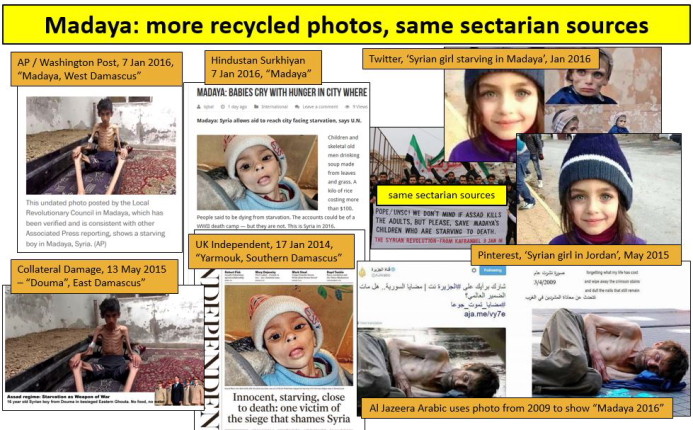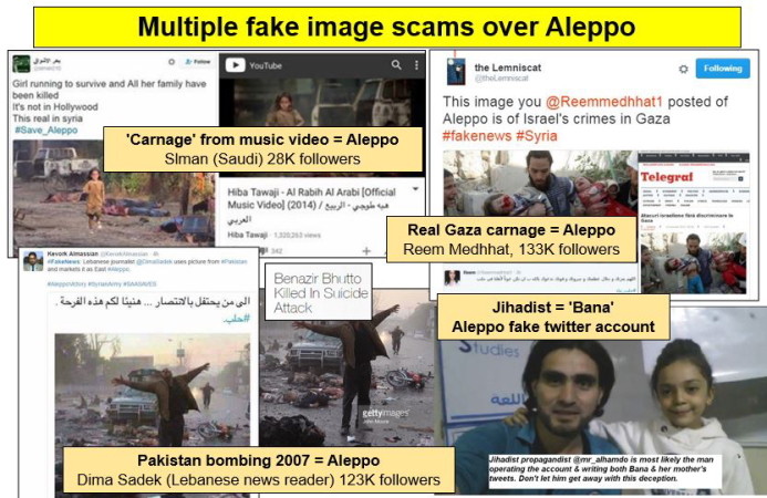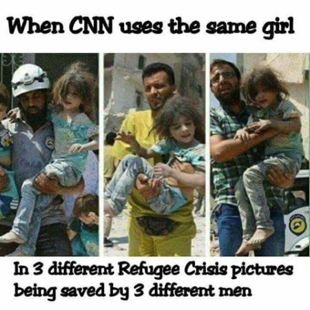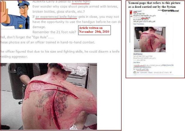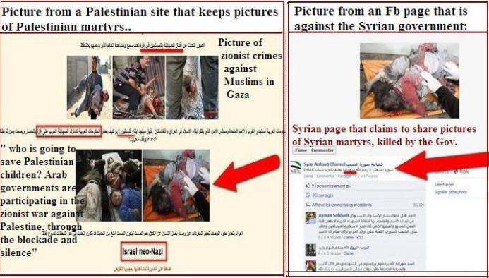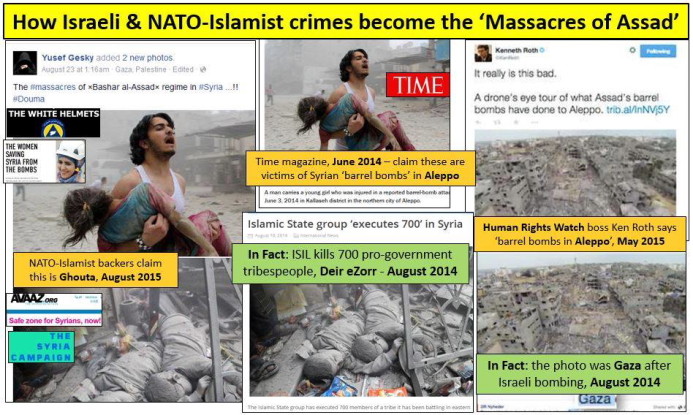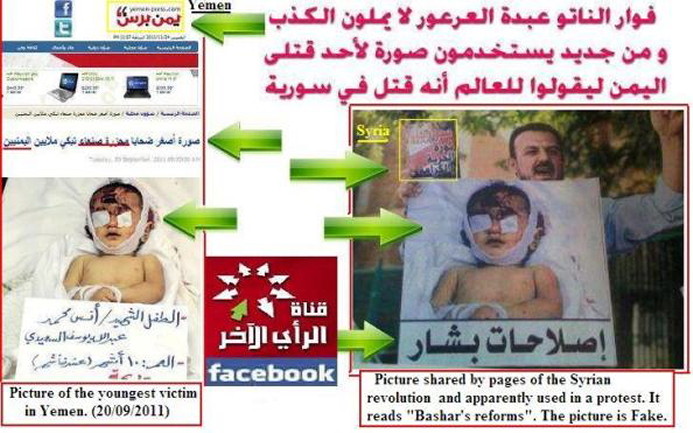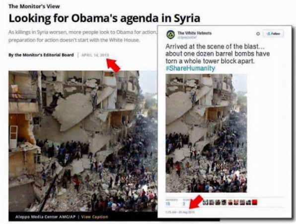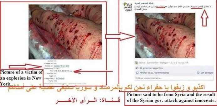 - Imagens reais da Síria usadas várias vezes, com datas, nomes das vítimas e localizações diferentes;