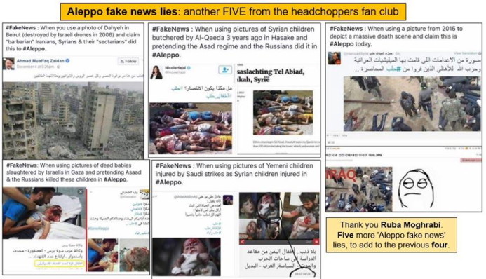 Segundo os media ocidentais que adoram citar os White Helmets e o Observatório Sírio dos Direitos Humanos, segundo as suas supostas notícias, segundo os vídeos e fotografias que partilham de forma frenética, éramos levados a acreditar com 100% de certeza em 2 pontos: primeiro, os russos e sírios bombardeavam e matavam diariamente civis de forma indiscriminada; segundo, os White Helmets não tinham mãos a medir perante tamanha quantidade de feridos e mortos a resgatar. No Entanto, no passado mês de Dezembro, após a libertação total de Aleppo pelos sírios (e seus aliados), quantos White Helmets foram encontrados no local? Zero. E material dos White Helmets? Nenhum, rigorosamente nenhum, nem uma farda rota, ou um capacete deixado para trás, nada, absolutamente nada. Como se os White Helmets (e trafulhas como o palhaço Anas al-Basha) não tivessem estado nunca em Aleppo, e que os seus vídeos e fotos não passassem de encenação! Teoria da conspiração minha? É possível, mas só volto atrás no que acabei de dizer se alguém for agora capaz de mostrar uma prova, uma única prova que seja da presença dos White Helmets encontrada na Aleppo leste agora livre. Estas encenações terão tido lugar seguramente em zonas controladas pelos "rebeldes" terroristas (região de Idlib) ou inclusive fora da Síria. Ainda há dias a polícia egípcia prendeu vários jornalistas apanhados a produzir falsas notícias sobre a Síria usando para o efeito um edifício em ruínas e uma menina pintada de roupas rasgadas e sangue falso: