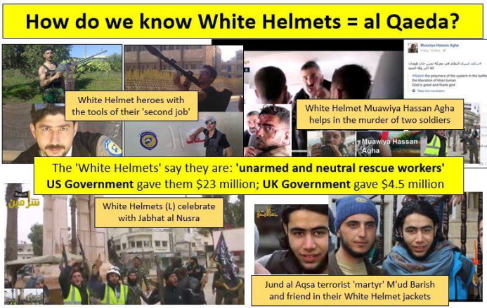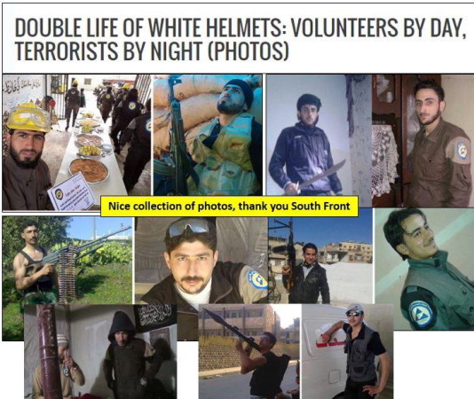 Embora exista uma enorme quantidade de informação online que permite incriminar e desmascarar totalmente esta farsa terrorista de "socorristas" chamados White Helmets, gostaria de acrescentar um muito interessante vídeo da RT sobre um membro dos White Helmets filmado junto de corpos decapitados de soldados sírios. Os White Helmets, esses maravilhosos humanistas neutrais que se voluntariam para socorrer pessoas, supostamente, hehe, quando confrontados com tão absurda situação, que reacção têm? Mmmm, reconhecem que o senhor em questão é mesmo um membro dos White Helmets e, por não estarem nada contentes com a participação de um dos seus elementos em decapitações e enterros em valas comuns e tal, mmmmm, DESPEDEM-NO! Ahh, coitado, ficou sem o seu emprego "voluntário" nos White Helmets! Aliás, mentira, depois voltou a ser empregado pelos White Helmets. Ah, pois, sim, os "voluntários" terroristas dos White Helmets recebem muito bons salários! Leia artigos da Vanessa Beeley sobre este tópico!